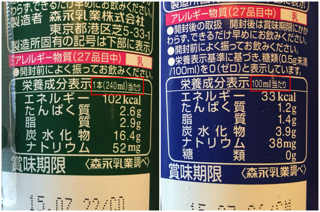 特にカロリーオフの商品に関して、できるだけ数字を小さく見せるために、「100ml」「100g」あたりの数字を表示していがちなイメージがあります。