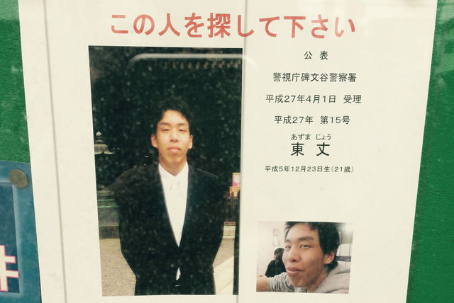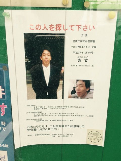 写真の青年「東丈」さんは今年の3月29日に東京都目黒区自由が丘で失踪されたそうです。
