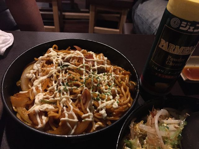 ナポリ焼きそば、600円。粉チーズたっぷりかけていただくナポリタン風味の焼きそばです。
