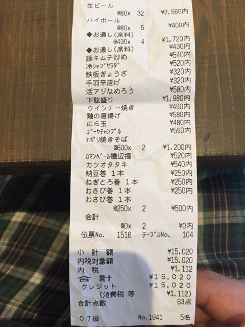 5人で15,000円。だいたい一人あたま3,000円。ちょっとフード頼みすぎましたかね。