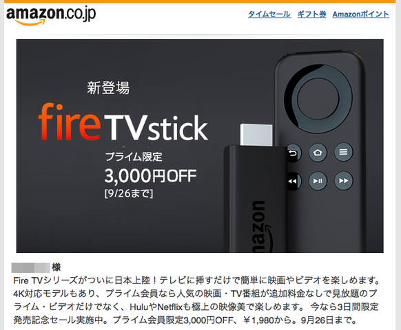 実はこの「Fire TV Stick」、9月24〜26日の3日間だけ、プライム会員限定で、3,000円オフの1,980円で販売していた。