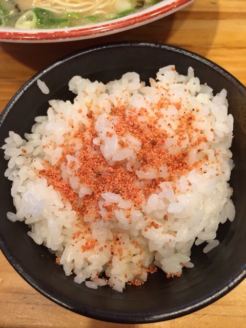 卓上には「明太ふりかけ」が置いてあり、それをライスの上にふりかけても良し。周囲のお客さんの様子を見れば、ラーメントッピング用の辛子高菜や紅しょうがなどを乗せても良し。