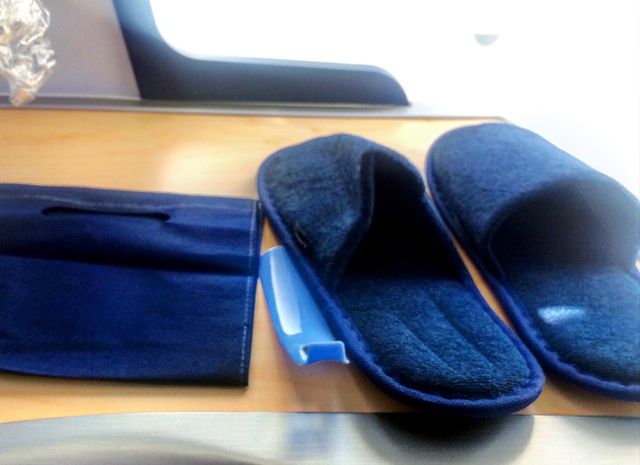 目の前には18インチのタッチパネル・モニターがあり、その下は足を伸ばせるスペースがあり、さらにその上は下足入れになっているようだ。さっそく靴を脱ぎ、アメニティのスリッパに履き替えた。