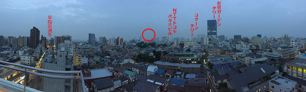 iPhoneのパノラマで撮ると、こんな眺めになります。早稲田通りからぐるっと新宿を眺め、高田馬場ビッグボックスまでを一望できますよ。この眺め、いい……。