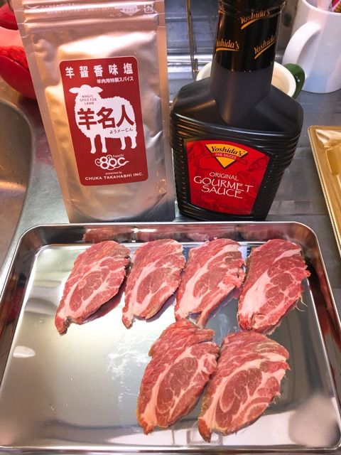 用意したのは、生のラム肉と、「羊名人」と、なぜか「ヨシダ グルメソース(グルメのたれ)」。