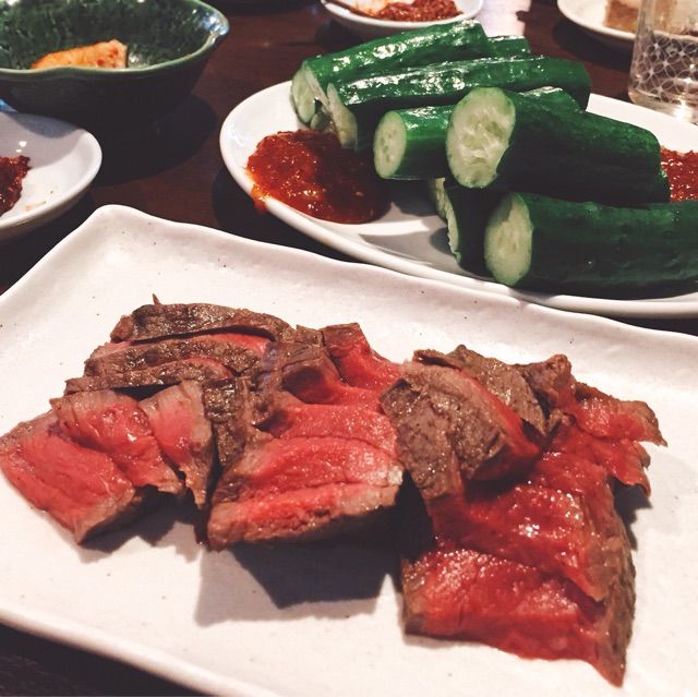 自分で焼く焼肉ではなく、店員さんがテーブルで焼いてくれる焼肉でもなく、いい具合に焼き、レアな感じが残った塊の赤身肉を、みっしりがっしりとっくり楽しむのみなのです!