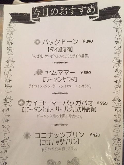 というわけで2月。「今月のオススメ」としてメニューに掲載されていた「パックドーン」「ヤムママー」「カイヨーマーパッガパオ」……え、どれも見たことないんですけど……。