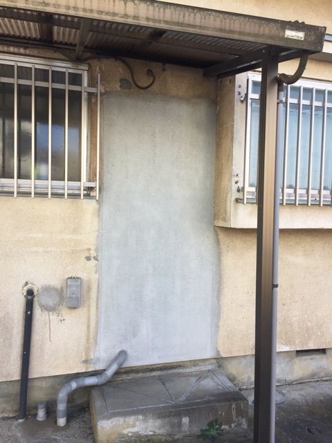 確実に人がお住まいになっている、ここはもともとお勝手口か、裏口か。正面道路に面する玄関もすぐ横にあり、あとから「いらねえな」と住人が潰してしまったのか、完全にコンクリに埋められたドアの跡。