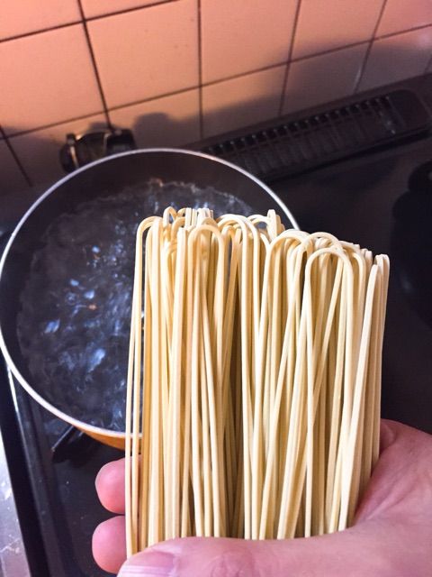 液体スープのあごだしを規定量のお湯で溶かし、インスタントラーメンのように麺の茹で汁はスープには使いません。たっぷりの湯で踊らすように麺を茹でると……