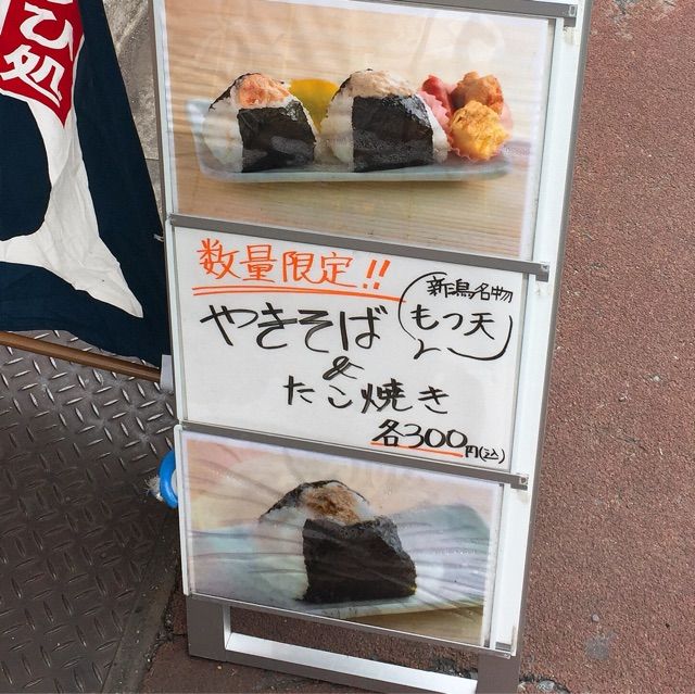 焼きそばやたこ焼きは、もはやおにぎり屋さんのアイデンティティがないな、というツッコミは野暮だからしませんが、ここで気になる文言は「新潟名物もつ天」です。なにそれ。モツの天ぷら? 食べたことないな。