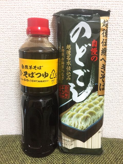 こちらです。新潟ご当地蕎麦である「越後伝統へぎそば」と、「そばつゆ」。会社名だけでなく商品名までもがシンプルかつド直球。
