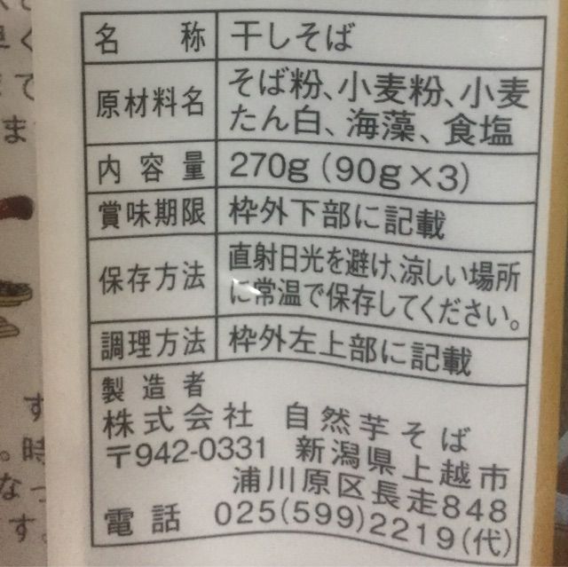 それはそうと、食べてからもう一度パッケージを見て驚愕。「株式会社自然芋そば」の「へぎそば」は、自然薯入ってない。