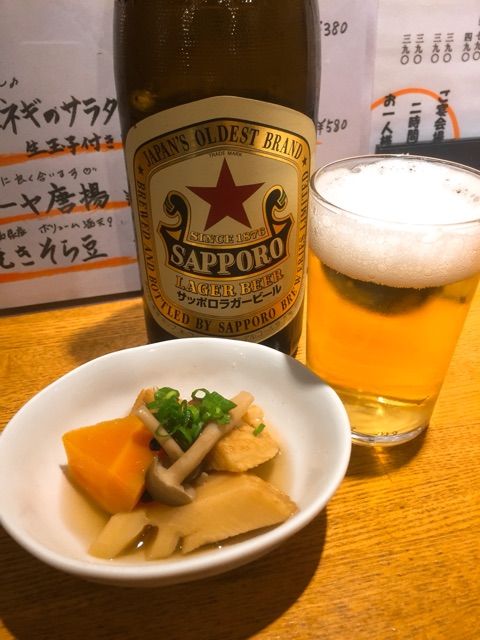 まずはサッポロラガーから。お通しは煮物で、昔ながらの居酒屋感高まります。