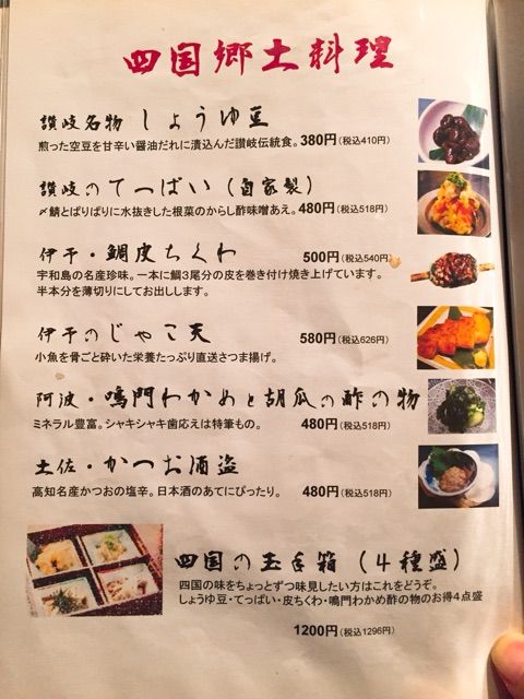 四国料理の店「一滴八銭屋」の四国郷土料理メニュー。