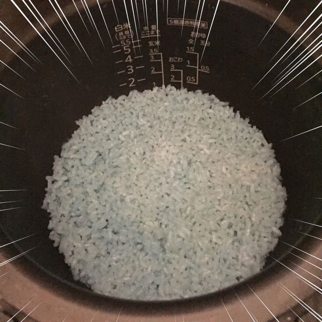 炊き上がりもけっこうヤバい! 暗い部屋で撮った写真なので、炊き上がりの青さはイマイチに見えるでしょ?