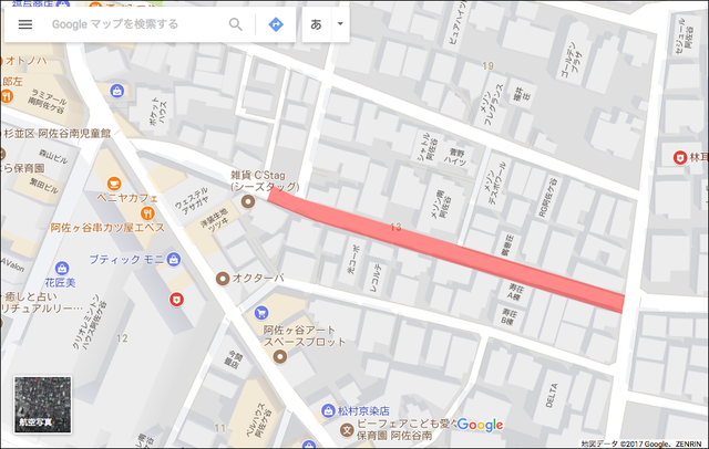 グーグルマップで言うと、この辺り。阿佐ヶ谷すずらん通り商店街の裏手。高円寺から荻窪まで住宅街の裏路地を選んで歩いているうちに、けっこうメインストリートの近くまで来ていたのですが、地図上に色を付けた赤いエリア。