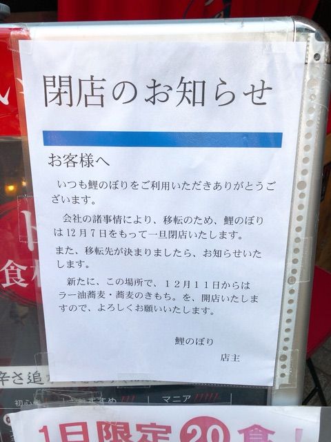 一応「移転のため」となっていますが、移転先は未定。現在の場所は、系列店の「ラー油蕎麦 蕎麦のきもち」となる業態変更だそう。