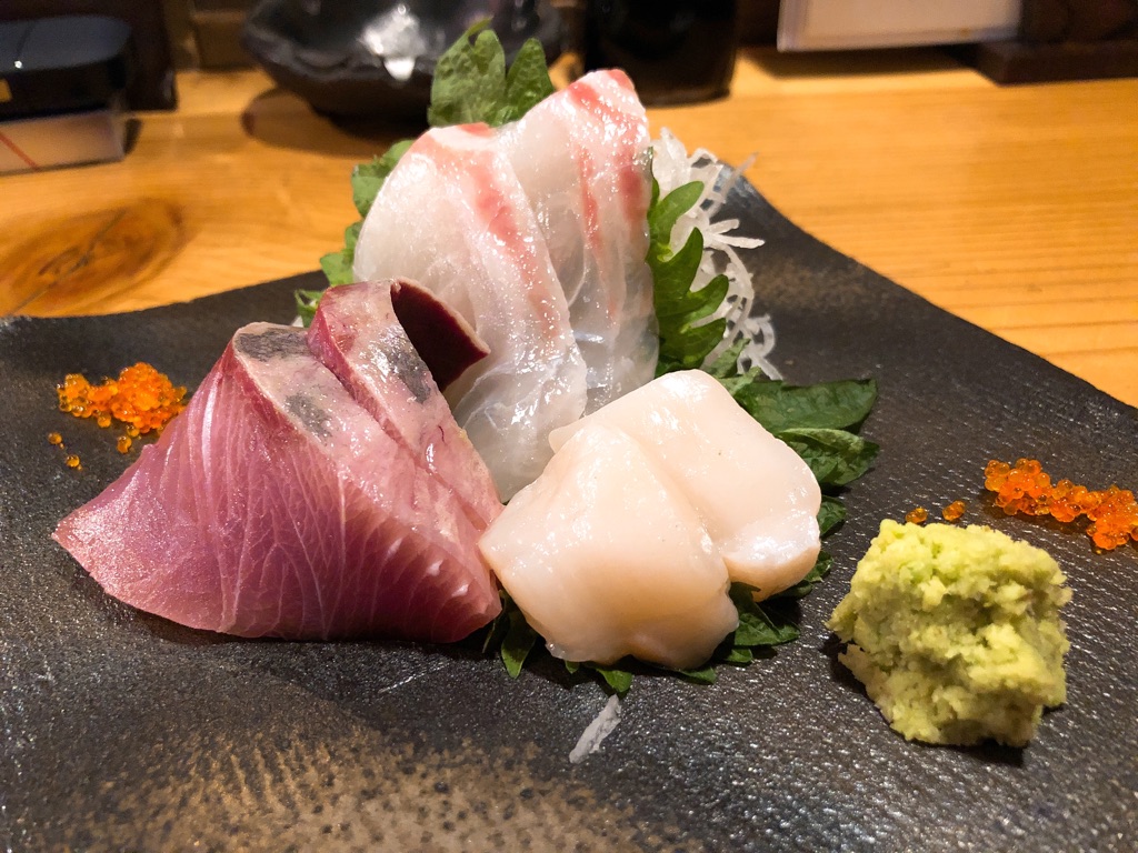 その日のオススメ刺身、3種盛りは、ちょい盛り対応、780円。この日はぶり、真鯛、ホタテ。