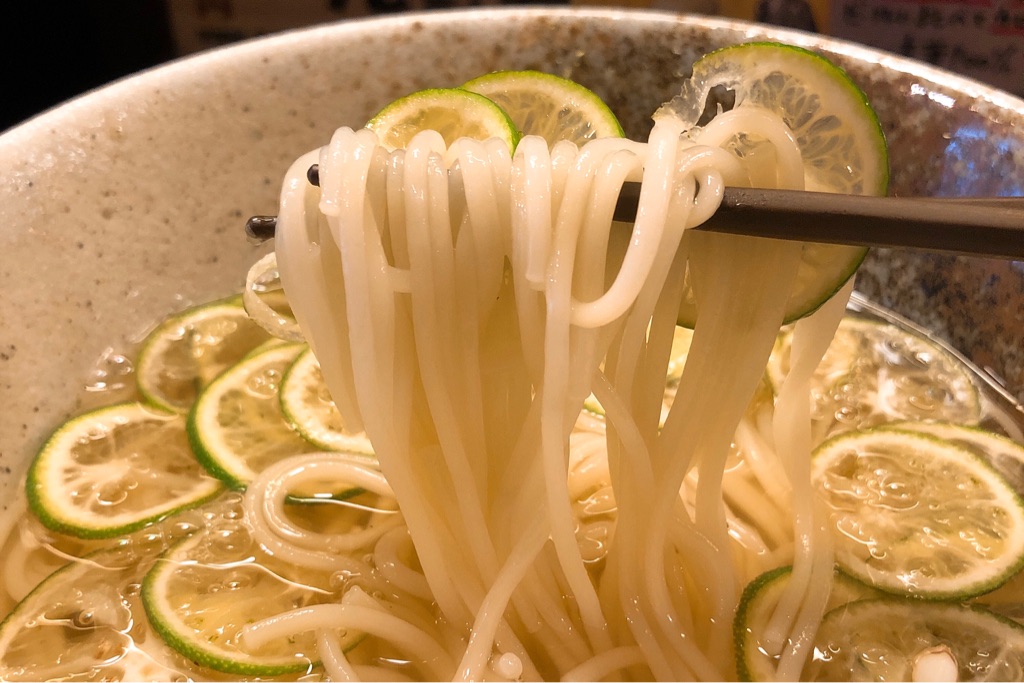 すだちのスライスたっぷり、清涼感ある「すだちそうめん」。何でこんな寒い時期に……と思うでしょ? これ温麺です。あったかいんですよ!
