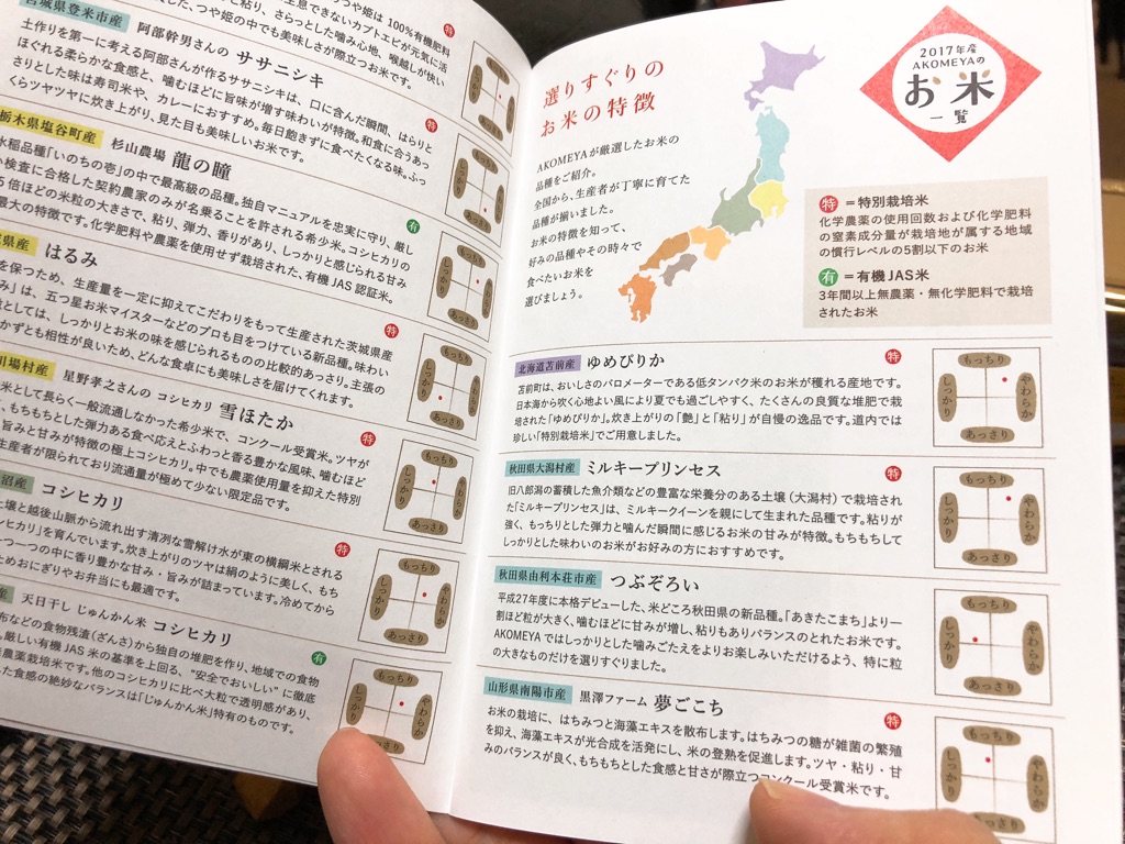 「アコメヤ」のパンフレットに記されているのは、取り扱っている全国各地のブランド米の由来、生産地、そしてその食味のリスト。