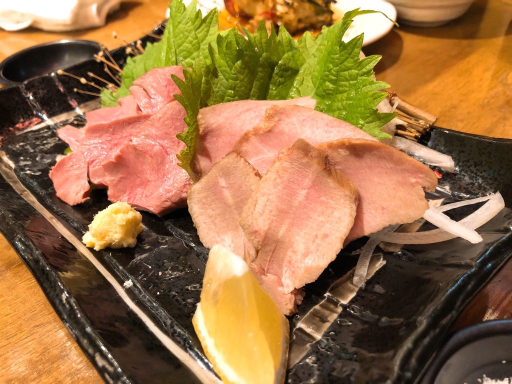 「みそおでん」と並びイチオシメニューとなっている「はつ刺し」(左・490円)と「たん刺し」(右・390円)。低温調理で安心、刺身としての生の味わいも残るなかなかの逸品。