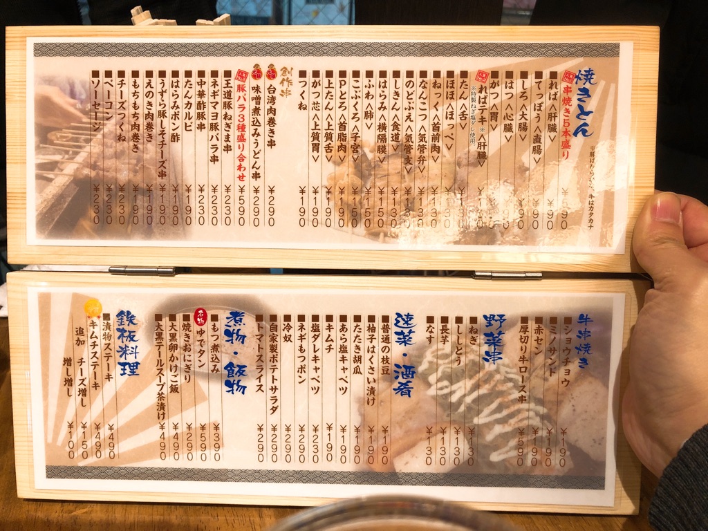 その他、通常メニューはこのとおり。90円からの焼とんは、5本盛りの盛り合わせがありますが、なるだけ好きなものを選びたくなる種類は19種。のどぶえ、しきん、ふわ、こぶくろ……焼とんの中でも珍味部位も揃っていますね。