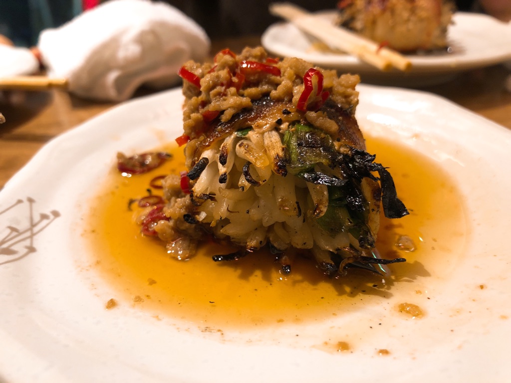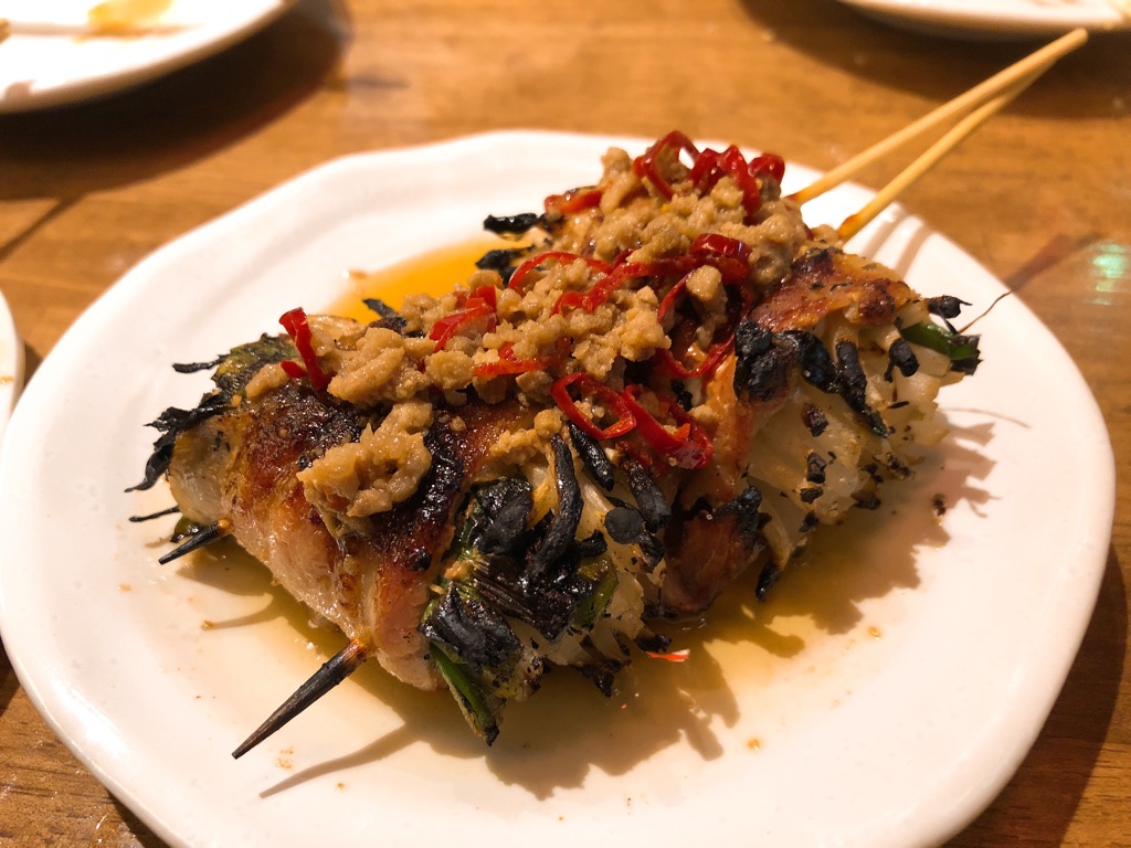 その正体は、もやしとニラを豚バラで巻き、唐辛子ミンチをトッピングした串。台湾ラーメンの具を串1本にまとめちゃった的な。