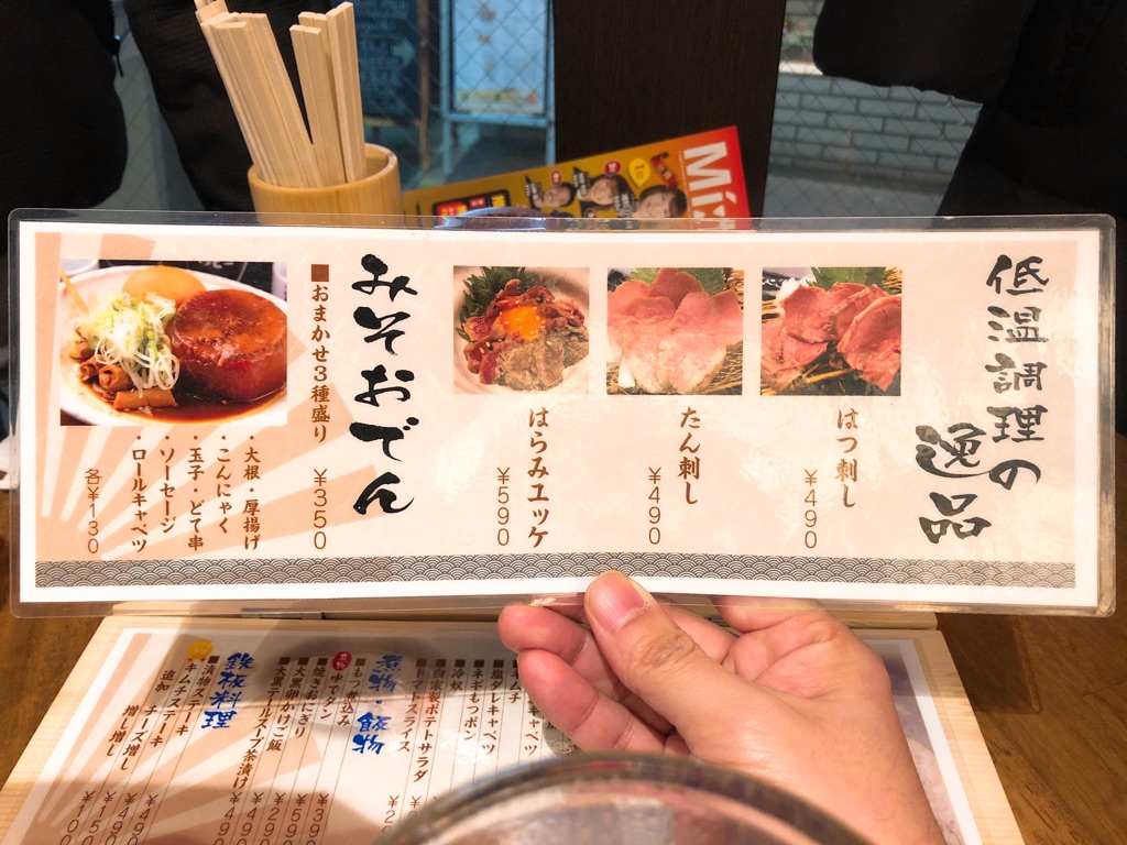 まずはビールを頼み、メニューを拝見。はつ刺し、たん刺し、はらみユッケ……うわあ、気になる〜。