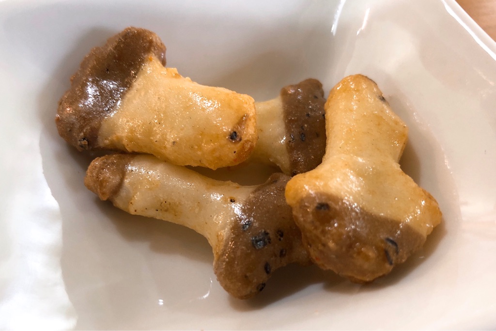 そしてこちらは「松茸あられ」。ガチで松茸の香りがするひとくちあられ。形も松茸を模しており、見た目もかわいい。