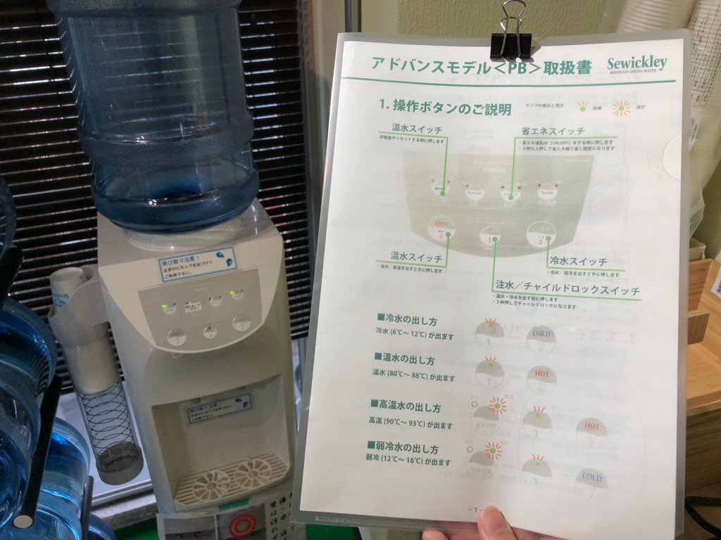 これが仕事場の給水・給湯器です。仕事場でカップ麺を食いたい時は、ここからお湯をいただきます。