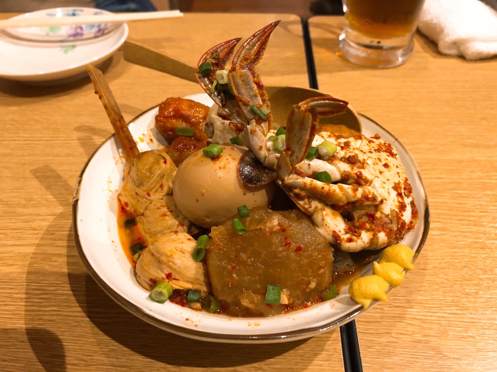 カニ出汁“赤おでん”はそのまんまカニ入り!高田馬場「もつ焼き おとんば」