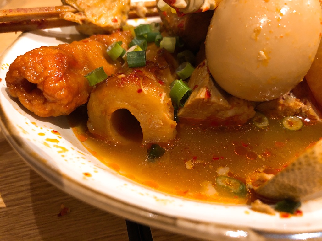 カニそのものがおでん種として乗っかっているのにもビックリしましたが、全体的に辛子で真っ赤っ赤。赤いってそういうことなの!?