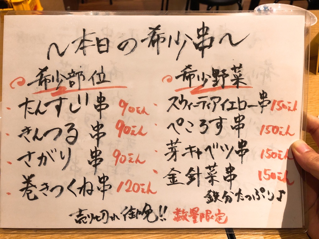 メニューを拝見。なるほど希少部位。たんすじ、きんつる、さがり。希少なのに90円。これはお得だぞ〜。