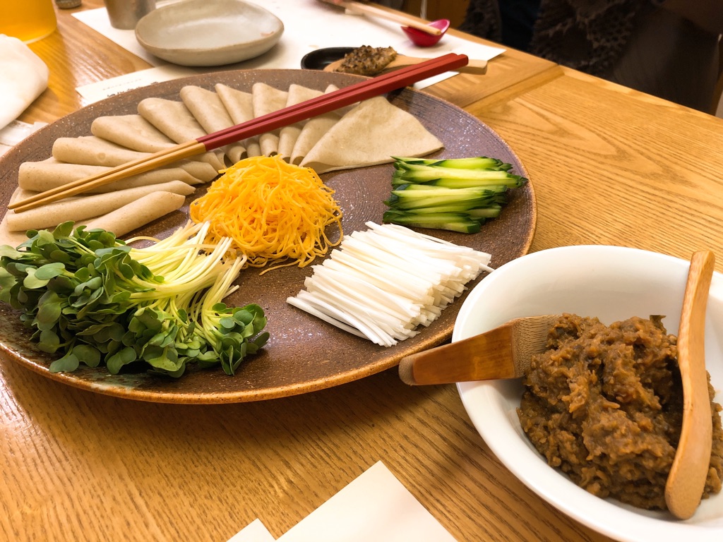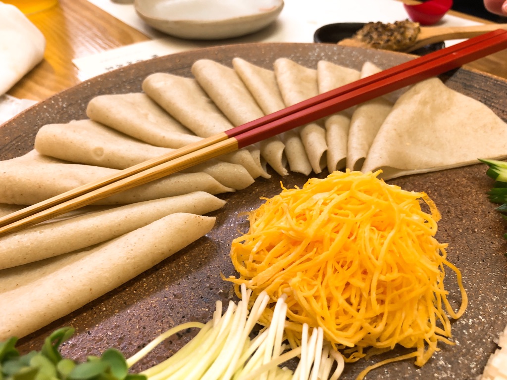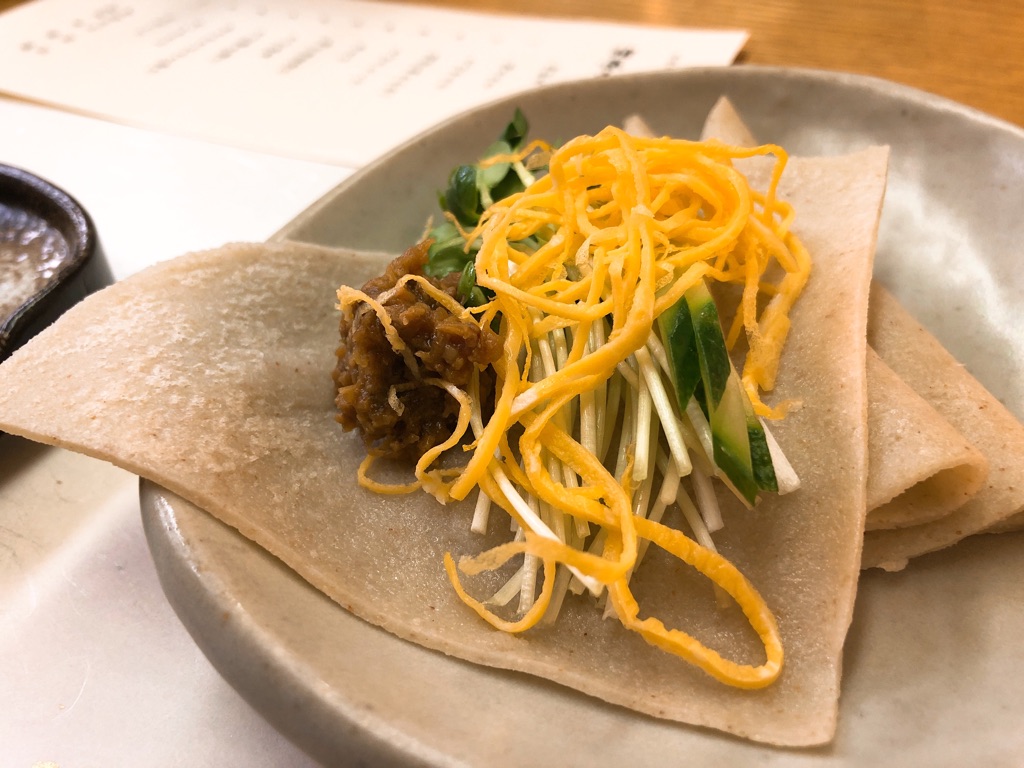 そば粉100%のそばクレープは、野菜や蕎麦味噌を挟んでいただきます。ガレットとはまた違う、焦げのないしっとり系の生地は、淡白ながら蕎麦の香りがよろしい。そして蕎麦味噌も蕎麦がふんだんに入っており、ゆるめの仕上がり。