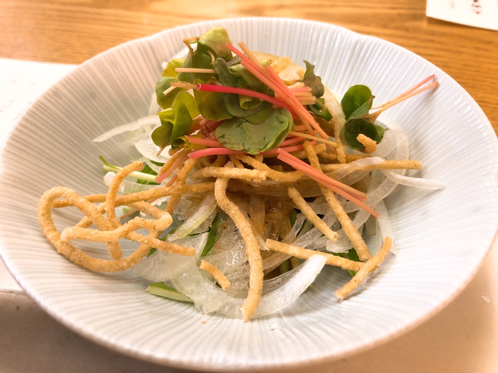 揚げた蕎麦がトッピングされたサラダ……と、軽く見るのは早計。上に乗っている赤い茎は、蕎麦の茎なんですって。