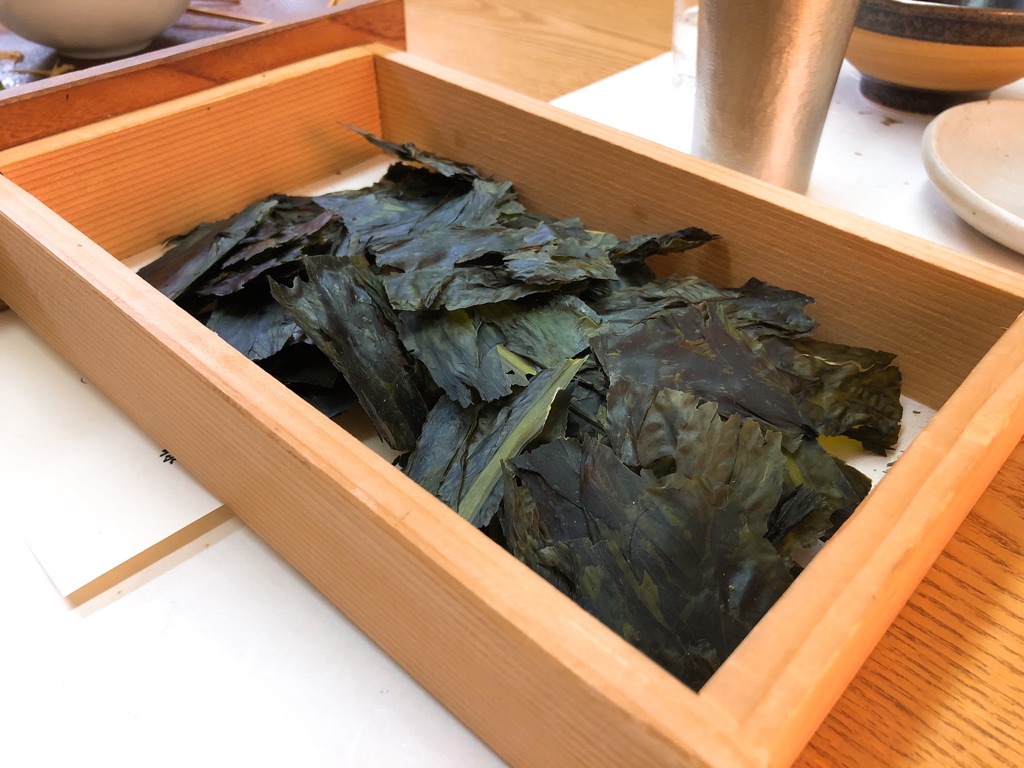 卓上の焙炉の上であたためられた、海苔のように薄く、パリパリと割れるわかめです。