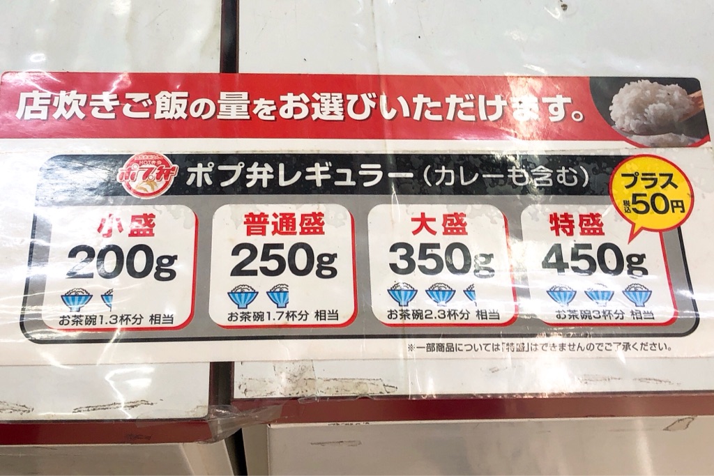 お弁当の店頭価格そのままで、小盛り・普通・大盛りに対応。大盛りでも350g(茶碗2.5杯相当)、50円増しで450gの特盛りにもできます。