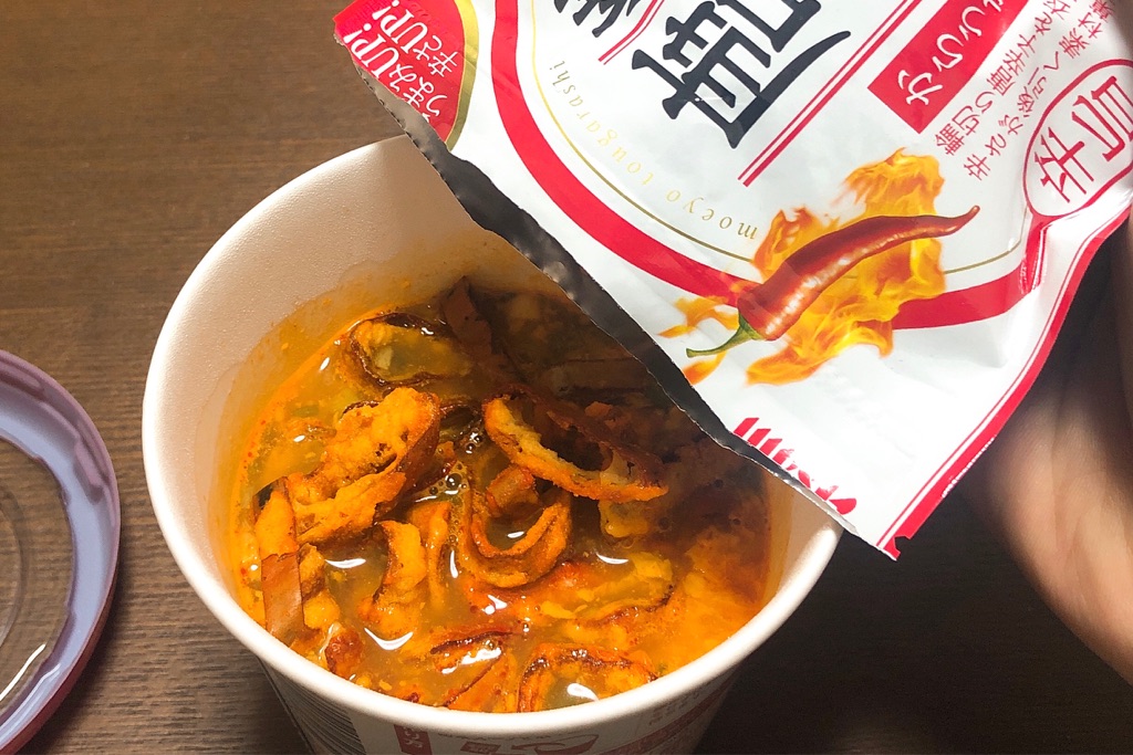 「燃えよ唐辛子」がカップはるさめスープになっちゃった!トッピング用に合わせて「燃えよ唐辛子」を買わせる作戦だな……!