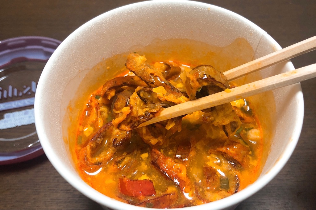 後のせの後にチャージした燃えよ唐辛子は、すべてスープでしんなり。せっかくのサクサク感がおいしい燃えよ唐辛子は、そのまま食べたほうがおいしかったかも……なーんてね…………。