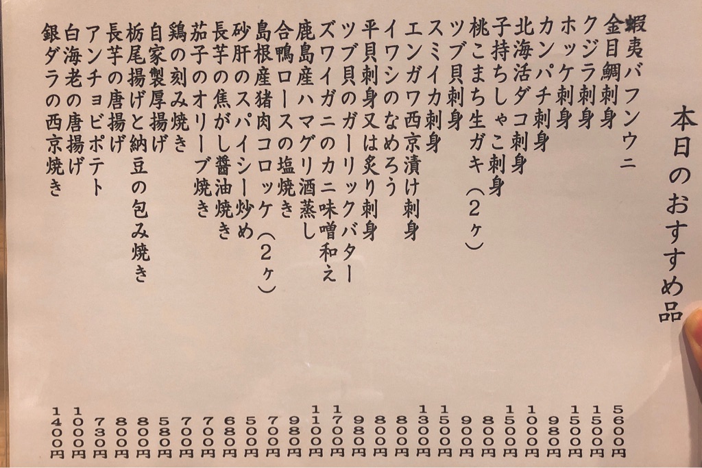 ランチタイムにやってきたイハラさんですが、卓上には夜の居酒屋メニューも置いてありました。海鮮の刺身が豊富ですね。