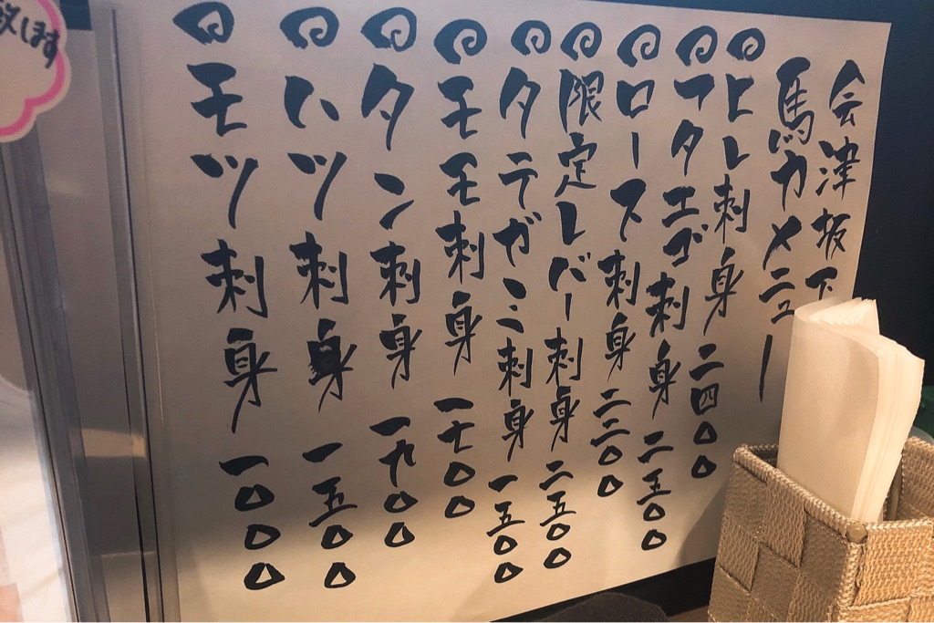 さらに会津直送馬肉メニューもあり、魚と馬を楽しめる純和風居酒屋として、かなり惹かれるものありますね。