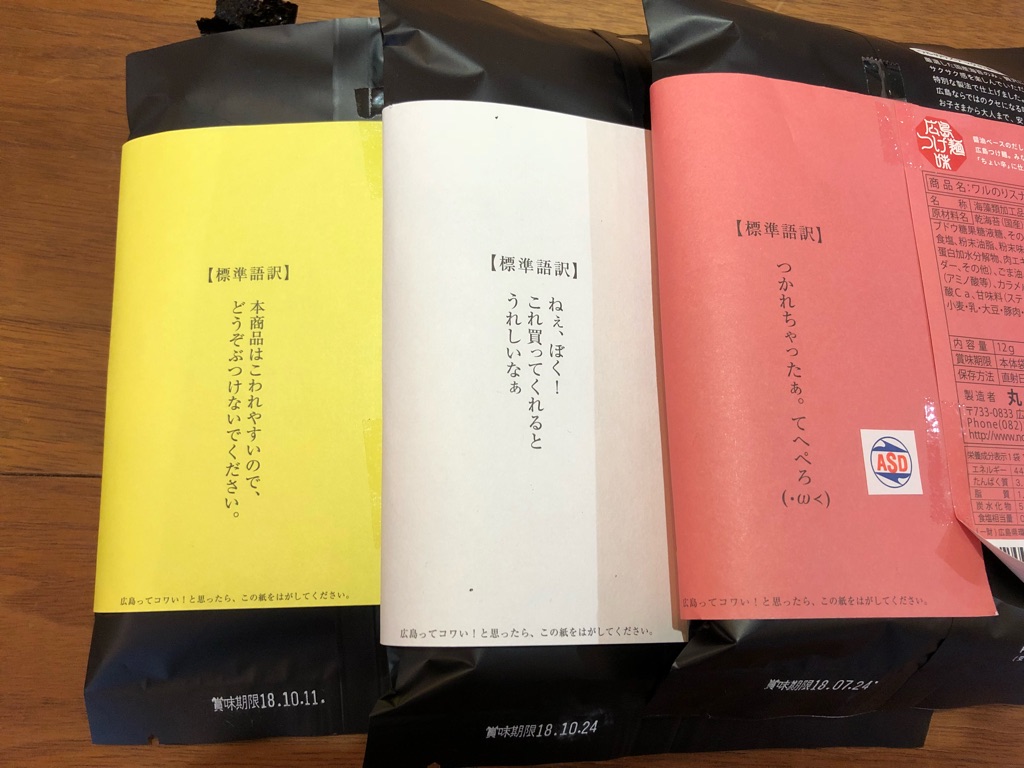 パッケージの裏面には、3つの広島弁の標準語役が記されています。