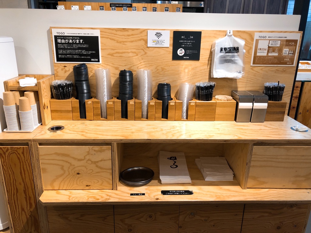 カップのフタ、テイクアウトの袋すらもセルフサービスという徹底的なコストカット。