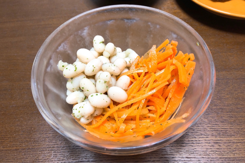「イタリアンデリカ Strada(ストラーダ)」は、テイクアウト専門のイタリアン惣菜と弁当のお店。東田妹暮らし〜さんによれば、ランチタイムにはお弁当(ランチボックス)が売っていたそうですが、私が潜入した夕刻には、既にほとんどの弁当・惣菜が売り切れ。かろうじて残っていたのは「インゲン豆のマリネ」と「ニンジンのマリネ」。