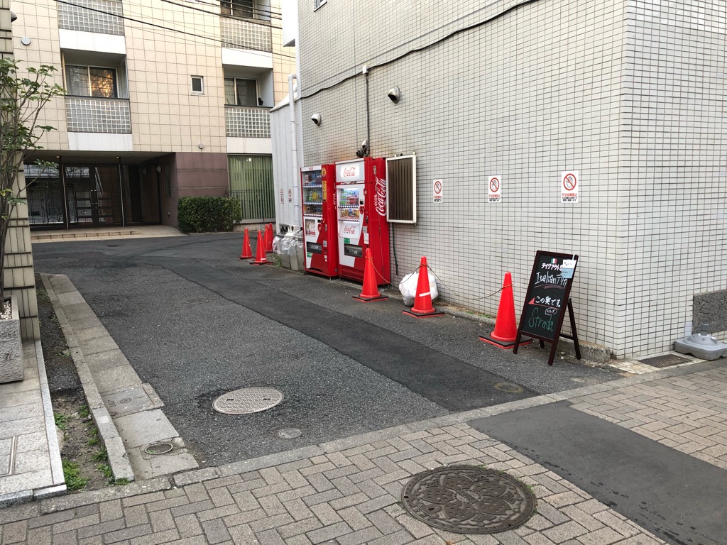 セブンイレブンとコイデカメラの間には通路がありますが、クルマ止めが立ち、奥には住人用の自転車置き場が見える。