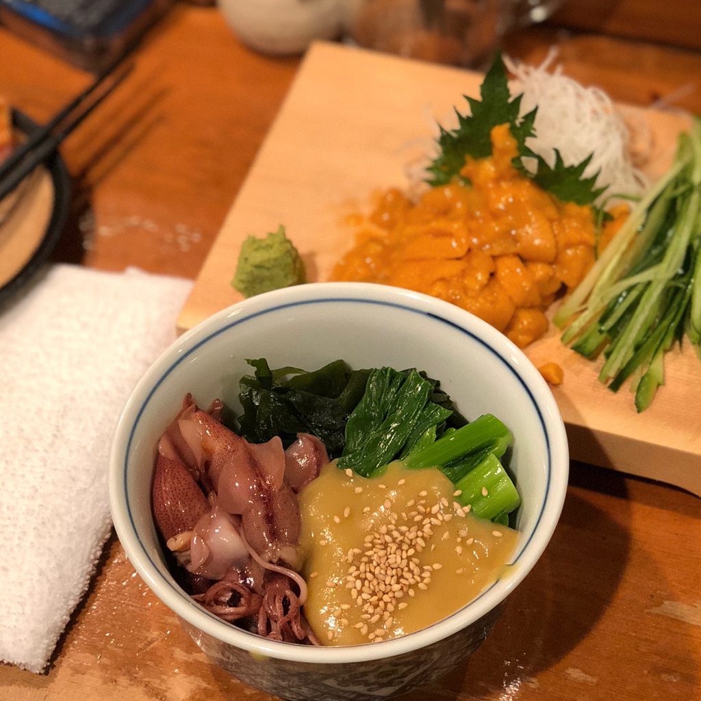 ホタルイカの酢味噌和えも、深い小鉢でたっぷりと。ボリュームだけでなく、彩りも良い。