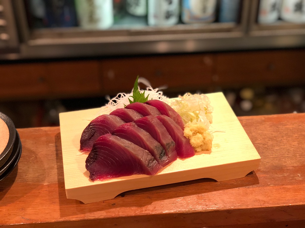 カツオもこんな厚切り。一人で来て刺身2品頼んだら、それだけで終わりそうだ。