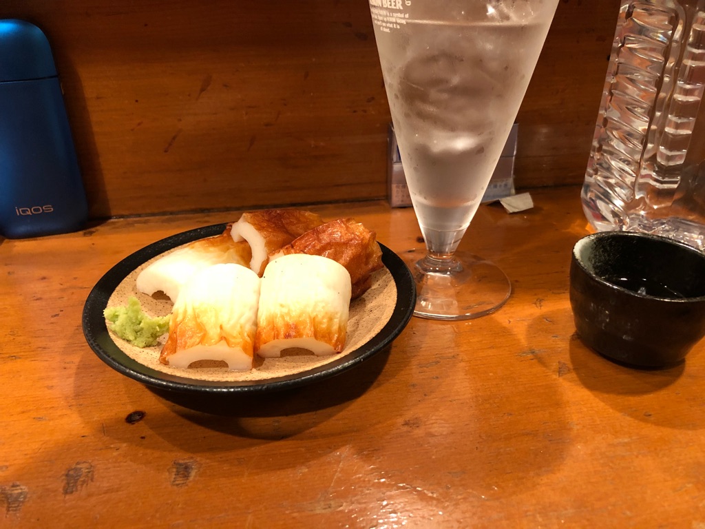 と、出されたお通しはちくわ。花見で昼から酒飲んでる休日の夕方。つまみも充分いただいている。