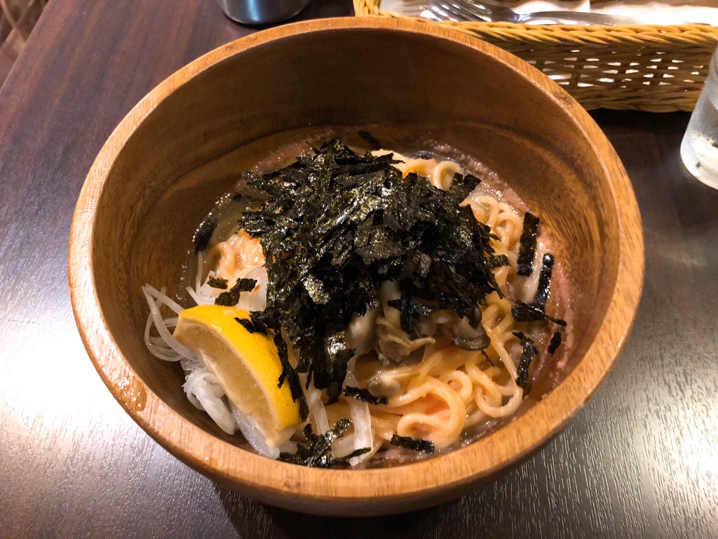 コッテリとした海苔・ウニ・タラコの海鮮和風味が、太麺パスタにしっかり絡み合い、並サイズでも食べ応えがあります。