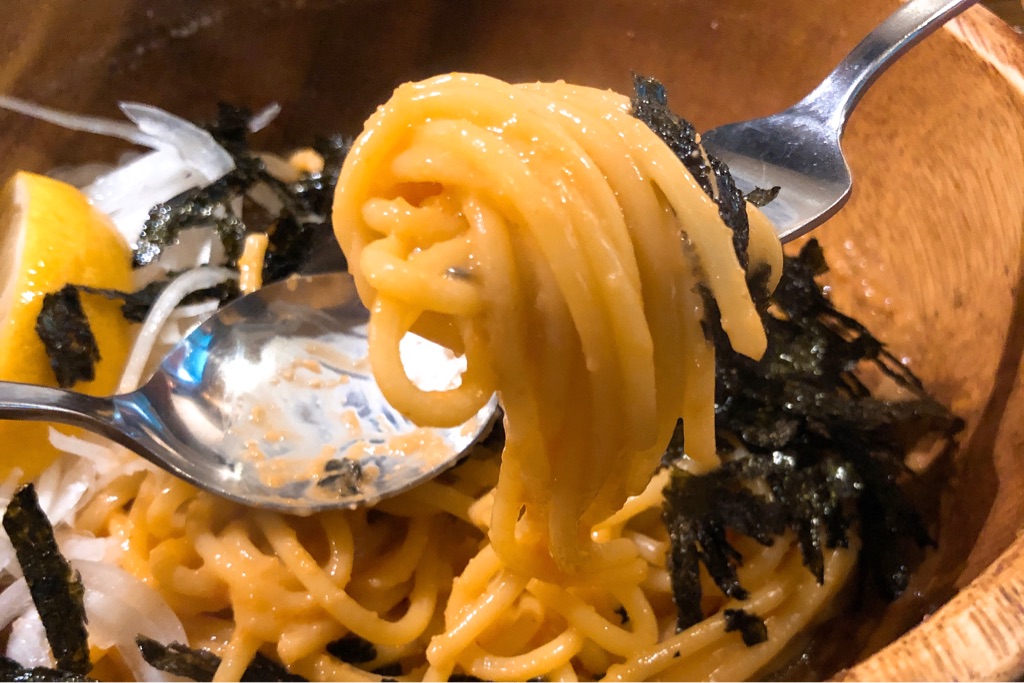 さて、そんな+400円のセット前菜を楽しんだあと、届いたメインのスパゲティは「ウニとタラコ」(1,050円)をチョイス。
